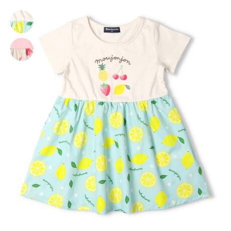 moujonjonのロゴとパイナップル、サクランボ、いちご、レモンのプリント入りTシャツに布帛のブロード素材の総柄スカートの異素材切替の半袖ワンピース。スカート部分がホワイトはレモン、ピンクはさくらんぼの総柄です。夏らしいフルーツがポップで可愛いアイテム。【アイテム】トップス シンプル ガーリー フェミニン カジュアル お洒落 オシャレ かわいい 可愛い 普段着 デイリーウェア お出かけ着 お外着 お外遊び着 子ども こども 女児 女の子 ガールズ キッズ ベビーサイズ トドラーサイズ 幼稚園 保育園 小学校 通園 通学 小学生 2025年春夏物新作 丸高衣料 白色 果物 チェリー 檸檬 パイン イチゴ ムージョンジョン コットン100% 綿100%