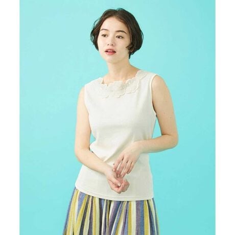 ホコモモラで定番のレースタンクトップ。程よいフィット感のあるすっきりシルエットです。前襟ぐりに同色で刺繍したお花のパーツを付け、華やかにお仕立てしました。デイリー使いにぴったりなタンクトップは色違いで揃えたいアイテムです。