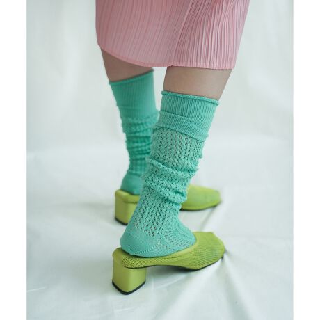 レース編みのハイソックスはボトムとシューズの間を繋ぐ脇役であり主役になるデザイン。
