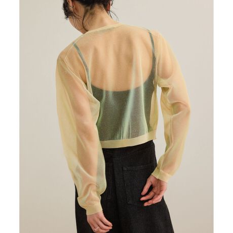 糸にインパクトがあるので、ベーシックで使いやすいクルーネックカーディガンに落とし込みました。ショート丈でコンパクトに見えながら、バストやアームホールはゆとりのあるサイズ感にしています。