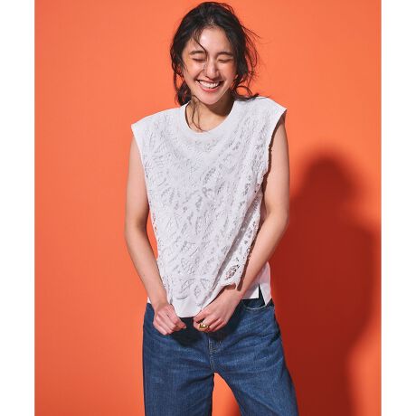 フレンチスリーブの前身頃にレースをドッキングしたクルーネックプルオーバー。脇にスリットを入れているので、前身頃はジャージー素材のみボトムにインすると、レースのスカラップが立体的になり華やかさをプラスします。パンツにもスカートにも合わせやすく、コーデにほど良いフェミニンさをプラスします。カラーは清潔感のある印象のホワイト(#001)、シックなブラック(#005)、洒落感のあるベージュ(#033)の3色展開です。