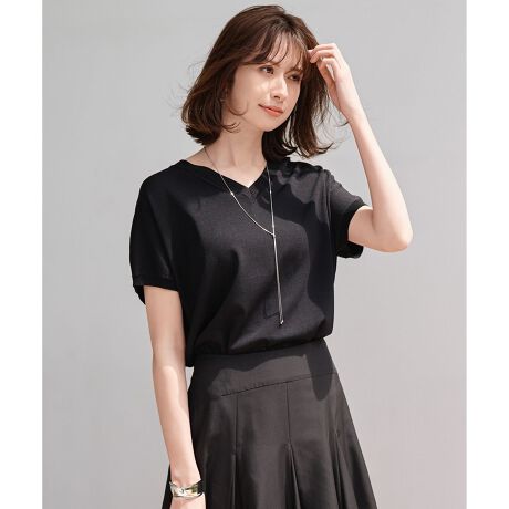 ■デザイン大人のこなれ感を演出してくれるVネックのフレンチスリーブニット。体のラインを拾いにくい、程よくゆったりしたサイズ感で、脇下から裾に向かうラインがお腹周りをカバーしつつ、着用するとニュアンスのあるシルエットになります。コンパクトニット(KRUMGM0420)と同様に、バックスリットと後ろのセンターシームがポイント。