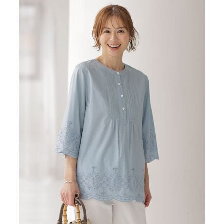 ■デザインピンタックデザインが入った刺?ブラウス。ヒップが隠れる丈感で、身体のラインを拾わずに楽チンに着ていただけます。今年は前後と袖の裾にオリジナルの刺繍とスカラップを施しました。春らしい印象の刺?が目を惹く、カジュアルからきれいめまで様々なスタイリングとマッチする優秀アイテム。すっきりとしたボトムスと相性の良い1着です。