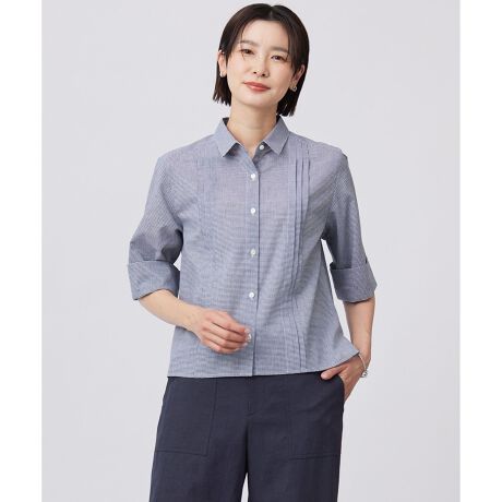 ■デザインフロントピンタックディテールのボクシーなシャツ。ストレートシルエットのサイドスリット入りで、程よい抜け感を演出してくれます。前後差ありのショートレングスはワイドパンツやボリュームのあるボトムスに相性抜群。ゆとりのある袖もストレートで折り返しのできる6分袖になっています。きっちりとしたシャツカラーにゆったりとしたボディは1枚でも決まる大人のトップスになっています。