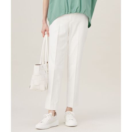 機能性と美シルエットにこだわったテーパードパンツ■デザイン着心地の良さと、脚のラインが美しく見える程よいフィット感にこだわったテーパードパンツです。センタープレスが美しい立体感と上品さを与えてくれるデザインです。きちんとしたパンツに見えながら、ウエストの後ろ部分はゴム仕様になっており、素材のストレッチ性も相まって快適な着心地です。前はファスナー開き仕様で、腰周りをよりすっきりと見せてくれます。合わせるトップスを選ばず、オンオフも問わずデイリーや通勤など様々なシーンで活躍するデザインに仕上げました。■素材東レの機能糸シェルタリングドライを使用したオックスストレッチ素材です。透けにくく、吸水速乾性があり、ドライなタッチと綿麻複合による天然素材のタッチをブレンドしつつ、適度なシワ感によるナチュラルな見え方が特徴的です。UVカット、接触冷感の機能性も併せ持っています。