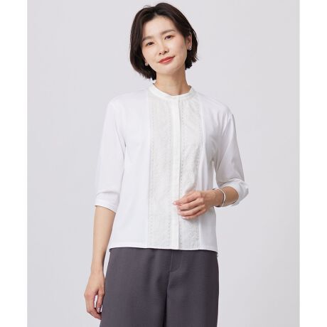 ■デザイン前見頃の生地刺繍がポイントの前開きのブラウスライクカットソー。前立てと衿は無地の布帛を使用し型崩れがしにくく、きちんと感を演出してくれます。すっきりとした印象で、スカートやパンツともに合わせやすいアイテムです。身頃はジャージなので、伸縮性があり着心地の良さも兼ね備えた1着です。
