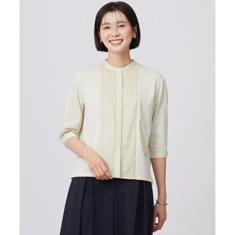 ■デザイン前見頃の生地刺繍がポイントの前開きのブラウスライクカットソー。前立てと衿は無地の布帛を使用し型崩れがしにくく、きちんと感を演出してくれます。すっきりとした印象で、スカートやパンツともに合わせやすいアイテムです。身頃はジャージなので、伸縮性があり着心地の良さも兼ね備えた1着です。