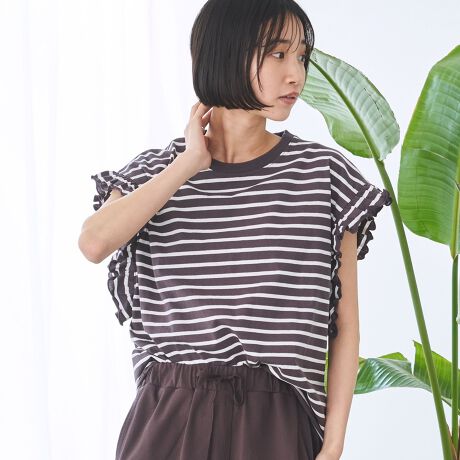フリル袖が華やかさを添える、人気デザインのボーダーTシャツ。