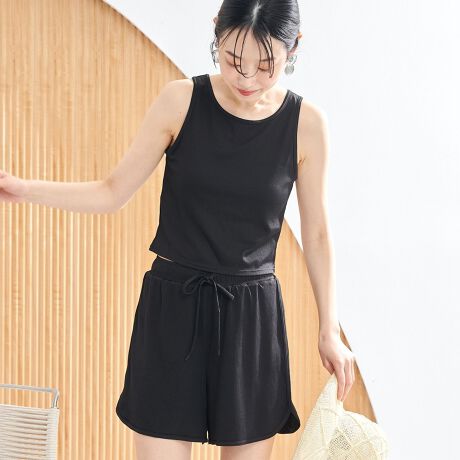 トレンド感のあるショート丈ながら、内側にショーツが一体化しているため安心感のある着用感。
