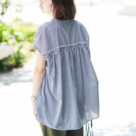 オンもオフも涼しく快適、防しわ機能のついたさらさらギャザーブラウス