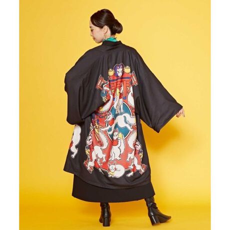 【倭物やカヤ×中村杏子】レトロポップでカラフルな絵柄が特徴のイラストレーター、中村杏子氏とのコラボ商品。「七福神」と「狐」はコラボのための書き下ろし。着物のようなシルエットの長丈の羽織り。リバーシブルで着られるので、柄の面と無地とで二度楽しめるデザインです。