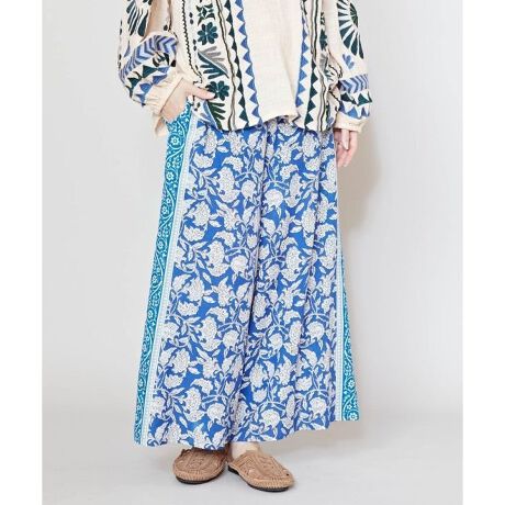 [型番:IKH-5110-2025]柄の切り替えが個性的なレディースパンツ。華やかなシルエットを生み出すボリューム感と、ブロックプリント風の暖かい花柄が魅力的。