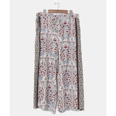 [型番:IKH-5110-2025]柄の切り替えが個性的なレディースパンツ。華やかなシルエットを生み出すボリューム感と、ブロックプリント風の暖かい花柄が魅力的。