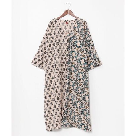 インド綿素材のワンピースにもなるロングシャツ。シルクロードの交易品モチーフをブロックプリントしたシリーズ。メタルボタンがポイント。それぞれの柄の由来は【WHITE】紅花&綿、【BLUE】壁タイル&ガラス工芸【GREEN】汗血馬【YELLOW】食器&調味料