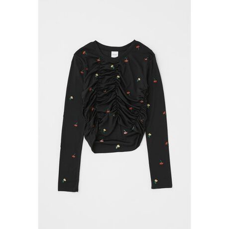 [型番:010ISL80-7401]【FLORAL RANDOM GATHER LS TSJ / フローラルランダムギャザーロングスリーブTシャツ】フロントのランダムギャザーが特徴の長袖トップス。今年らしくアップデートしたツルッとした生地に、オリジナルで作成した花柄の刺繍を施しました。デニムはもちろん、スポーティーなアイテムやカーゴパンツなどと合わせるのもオススメ。■透け感:なし■光沢感:なし■伸縮性:あり■裏地:なし