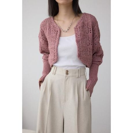 ■クロシェニットボレロ■ポイントクロシェ編みのニットボレロです。■ディティール繊細なクロシェ編みを使用した女性らしいニットボレロです。トレンドのシアー感のあるディティールがポイントです。清涼感たっぷりの柔らかいコットンタッチの素材を使用しており、クロップド丈でバランスの取りやすいシルエットです。■スタイリング透け感もあるのでインナーにカラーをさしたレイヤードも楽しめる1枚。タンクトップやキャミなどに羽織るだけで印象的なスタイルが決まります。■生地ナチュラル感のあるニット素材。透け感:あり裏 地:なし伸縮性:なし光沢感:なし[注意事項]※画像の商品はサンプルです。実際の商品と仕様、加工が若干異なる場合があります。※画像の商品は光の照射や角度、お使いのモニター環境により、実物と色味が異なる場合がございます。※着用、お取り扱いの際は、アテンションタグをご確認ください。