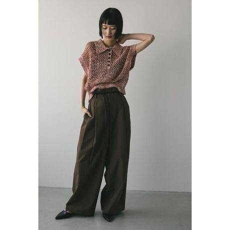 モデル身長166cm(FREEサイズ着用)大きめな襟がポイントの透かし編みのポロニット。カスリ染めしたポリエステルのスラブ糸をテープヤーンの片端だけに紡績した特殊な糸を使用。程良く色がミックスされているので表情のある一枚です。ストレッチあり、透け感ややあり。【お手入れ方法】手洗い可