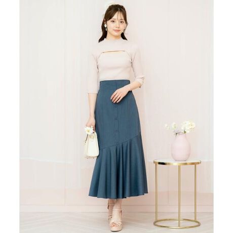 マーメイドラインを描くフレアヘムデザインが、レディ感を高めてくれるハイウエストスカート【Design】・すっきりとしたシルエットが縦のラインを強調してくれるヘムフレアスカート。・細見え効果抜群なハイウエストデザインで、華奢な印象に仕上げてくれます♪・アシンメトリーな裾のフレアデザインやフロントボタンがアクセントをプラス!・後ろは存在感のある大きなリボンになっており、ボタンで取り外しが可能◎・ウエストバックはゴムになっており、バックリボンを結ぶことでサイズ感の微調整が可能です。・左ファスナー仕様。・フロントは飾りボタン。【Fabric】・シーズンやトレンドに左右されない、ナチュラルな風合いのポリエステル生地を使用。・ピンク、インディゴ、ギンガムチェックの3色展開となります。【Care】ドライクリーニング