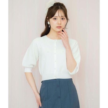 表面感のあるラメニットにフラワーモチーフをトッピングしたコンパクトカーディガン【Design】・透明感のあるフラワーモチーフとパールボタンが上品なアクセントに。・スリット糸を使用し、控えめながらキラキラと輝くシャイニー感が魅力♪・トップスとしても、夏の羽織りものとしても着回しできるコンパクトな着丈&袖丈に仕上げました。・ウエストインもしやすく、アウトで着てもウエスト位置を高く見せてくれます!・ふんわりとボリュームを持たせたスリーブが女性らしい優しい雰囲気を演出◎・袖口や裾は共地のリブ仕立てで、程よいフィット感があります。【Fabic】・夏も着やすい薄手で、ほんのりとシャリ感のある生地を使用。・ご自宅でお手入れが出来るのも嬉しいポイント♪・ホワイト、ホワイト×ピンク、ピンク、ブラックの4色展開となります。【Care】手洗い可能