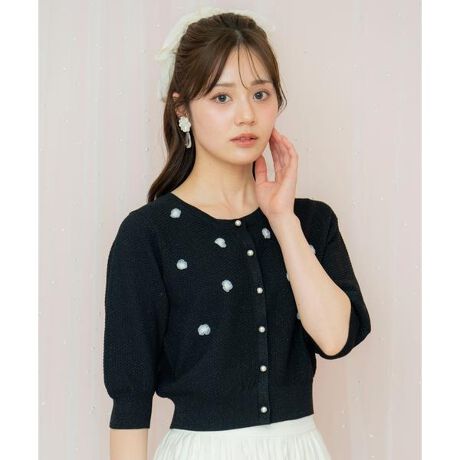 表面感のあるラメニットにフラワーモチーフをトッピングしたコンパクトカーディガン【Design】・透明感のあるフラワーモチーフとパールボタンが上品なアクセントに。・スリット糸を使用し、控えめながらキラキラと輝くシャイニー感が魅力♪・トップスとしても、夏の羽織りものとしても着回しできるコンパクトな着丈&袖丈に仕上げました。・ウエストインもしやすく、アウトで着てもウエスト位置を高く見せてくれます!・ふんわりとボリュームを持たせたスリーブが女性らしい優しい雰囲気を演出◎・袖口や裾は共地のリブ仕立てで、程よいフィット感があります。【Fabic】・夏も着やすい薄手で、ほんのりとシャリ感のある生地を使用。・ご自宅でお手入れが出来るのも嬉しいポイント♪・ホワイト、ホワイト×ピンク、ピンク、ブラックの4色展開となります。【Care】手洗い可能