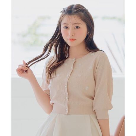 表面感のあるラメニットにフラワーモチーフをトッピングしたコンパクトカーディガン【Design】・透明感のあるフラワーモチーフとパールボタンが上品なアクセントに。・スリット糸を使用し、控えめながらキラキラと輝くシャイニー感が魅力♪・トップスとしても、夏の羽織りものとしても着回しできるコンパクトな着丈&袖丈に仕上げました。・ウエストインもしやすく、アウトで着てもウエスト位置を高く見せてくれます!・ふんわりとボリュームを持たせたスリーブが女性らしい優しい雰囲気を演出◎・袖口や裾は共地のリブ仕立てで、程よいフィット感があります。【Fabic】・夏も着やすい薄手で、ほんのりとシャリ感のある生地を使用。・ご自宅でお手入れが出来るのも嬉しいポイント♪・ホワイト、ホワイト×ピンク、ピンク、ブラックの4色展開となります。【Care】手洗い可能