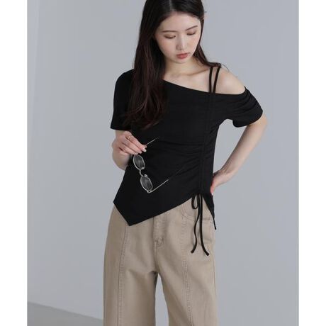 〔fabric&design〕ワンショルシャーリングカットソー(131-4260041)の半袖バージョン。素材は着やすいよう透けないフライス生地にしています。ワンショルデザインで肩紐から前身頃までドロストデザインになっておりギャザーを寄せて立体的なデザインになります。裾もアシメヘムでポイントに。肌につかず離れずのコンパクトシルエットです。〔stylinig〕コンパクトなデザイントップスなのでワイドデニムでカジュアルな着こなしがおすすめ。デニムミニスカと合わせで韓国っぽいスタイリングも◎