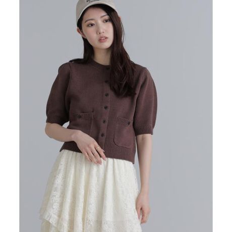 袖に目立てを入れてふんわりとさせたフォルムと、フロントのミニポケットがポイントの半袖カーディガン。すっきりとした印象の程よくコンパクトなサイズ感で、羽織にもボタンを留めてトップス風にも着こなせます。ざっくりとした表面感のある編地なので体のラインを拾いにくく、編地がしっかりしているのでダレにくさも◎。デニムパンツ・ボリュームのあるボトムスなど、シンプルなデザインなので幅広いコーディネートに活躍。トレンドのチノショートパンツと合わせて、トレンドライクな着こなしもおススメです。※モデルの着用画像の場合、光の当たり具合により、実際の色味と異なって見えることがございます。色味は、商品単体の画像をご参照ください。