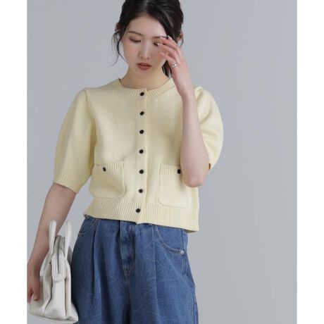 袖に目立てを入れてふんわりとさせたフォルムと、フロントのミニポケットがポイントの半袖カーディガン。すっきりとした印象の程よくコンパクトなサイズ感で、羽織にもボタンを留めてトップス風にも着こなせます。ざっくりとした表面感のある編地なので体のラインを拾いにくく、編地がしっかりしているのでダレにくさも◎。デニムパンツ・ボリュームのあるボトムスなど、シンプルなデザインなので幅広いコーディネートに活躍。トレンドのチノショートパンツと合わせて、トレンドライクな着こなしもおススメです。※モデルの着用画像の場合、光の当たり具合により、実際の色味と異なって見えることがございます。色味は、商品単体の画像をご参照ください。