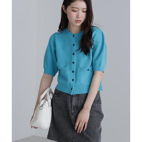 袖に目立てを入れてふんわりとさせたフォルムと、フロントのミニポケットがポイントの半袖カーディガン。すっきりとした印象の程よくコンパクトなサイズ感で、羽織にもボタンを留めてトップス風にも着こなせます。ざっくりとした表面感のある編地なので体のラインを拾いにくく、編地がしっかりしているのでダレにくさも◎。デニムパンツ・ボリュームのあるボトムスなど、シンプルなデザインなので幅広いコーディネートに活躍。トレンドのチノショートパンツと合わせて、トレンドライクな着こなしもおススメです。※モデルの着用画像の場合、光の当たり具合により、実際の色味と異なって見えることがございます。色味は、商品単体の画像をご参照ください。