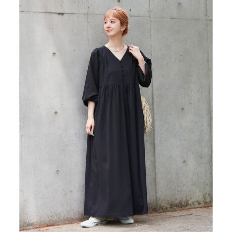 ゆとりのあるシルエットで女性らしさを引き立ててくれ、顔周りをすっきりと見せてくれるVネックデザインのワンピースです。すとんと落ち感のある素材でシワになりにくく、着丈もしっかりとあるので普段使いはもちろん、ちょっとしたお呼ばれやオケージョンシーンにもおすすめ。ネットに入れ、洗濯機洗い(弱)可能で気軽にお手入れできるのも嬉しいポイント。