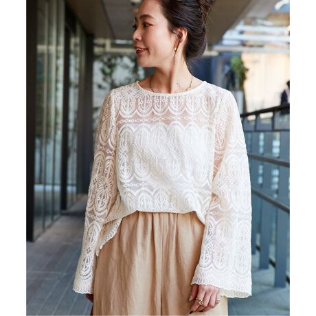 フレアな袖デザインと総レースがフェミニンなアイテムです。オンオフ兼用で着回しが可能なのでオフィススタイルにももちろん、デイリーなスタイリングにはデニムやカーゴパンツといったオーセンティックなボトムスとの合わせがおすすめです。手洗い可能でご自宅でのイージーケアができるのも嬉しいポイントです!