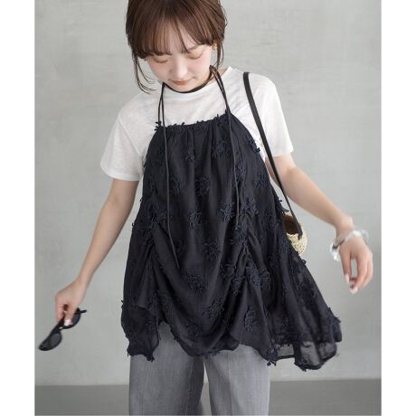 人気のエンブロイダリー素材をホルターネックのキャミソールに別注。