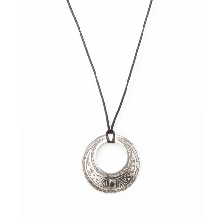 表面の文様は1刀1刀が手彫りで丁寧に彫られ、その文様にはそれぞれ意味があり、事物、物語、寓意などを象徴しています。 丸い穴の開いたネペンダントトップは部族の紋章の代わりとして持たれ、砂漠ではコンパスの役割を果たしていました。 円盤型のデザインが特徴的になり、全体に彫られた文様が美しく存在感のあるネックレスになります。 目を引くデザインのため、シンプルなスタイルをはじめ様々なコーディネートのアクセントとしてご使用頂けます。 紐にはあわじ玉を2つ付け、そのあわじ玉を移動させることで紐の長さを調節することができます。
