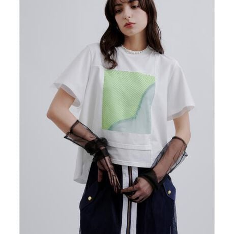 大メッシュと小メッシュを配色にして、アートのような切り替えをフロントに埋め込んだデザインTシャツ。カットソーは綺麗な目面の天竺で、真夏まで着用可能なドライタッチな生地感。右身頃はレイヤードデザインなので、フロントのアート風メッシュからインナーが透けること無く、立体的で動きのあるディティールに仕上がっており、裾はボトムにインすると、短丈Tシャツ風に見え、スタイリングの幅も広げてくれる。丈は前後差をつけ、袖はチュールを重ねてシアー感を取り入れたさりげないデザインポイント。