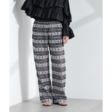 繊細に編み立てたボーダーレースの華やかなパンツ。ブラック×ホワイトのモノトーンで甘さをセーブした上品なルックスで、ON/OFFで着回しに活躍するアイテムです。