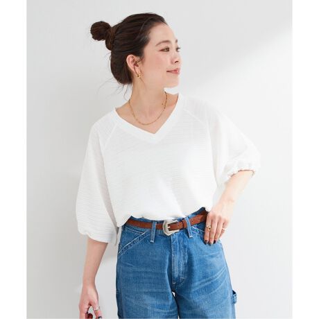 ぷくぷくとした表面感のあるフクレジャカード素材で、ナチュラルな光沢感が上品見えする布帛ライクな素材感です。オーバーサイズでボリュームのあるシルエットなのでVネックですっきりと見せ、太めのスリーブの袖口に入れたドローコードで丸みのあるパフスリーブにもできます。