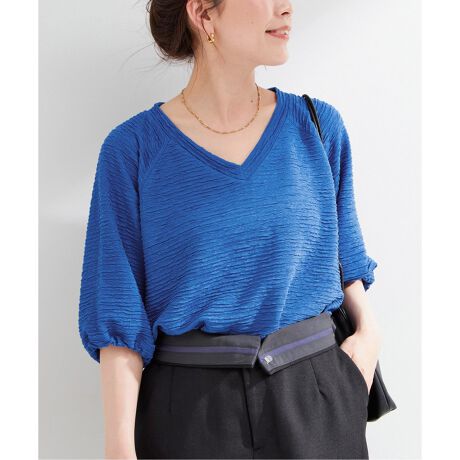 ぷくぷくとした表面感のあるフクレジャカード素材で、ナチュラルな光沢感が上品見えする布帛ライクな素材感です。オーバーサイズでボリュームのあるシルエットなのでVネックですっきりと見せ、太めのスリーブの袖口に入れたドローコードで丸みのあるパフスリーブにもできます。