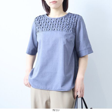 ヨーク部分にあしらった飾りピンタックがデザインアクセントのブラウスです。