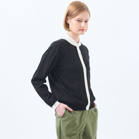<バイカラートリミングのクラシカルなニットカーディガン>