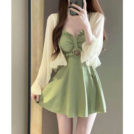露出を控えたい方や肌見せが苦手な方でも取り入れやすい、カーディガンとワンピースの水着2点セット