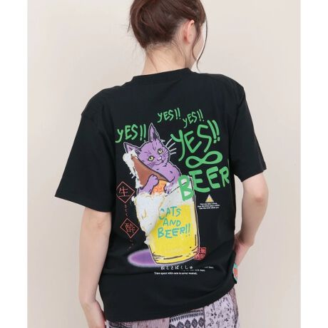 背中のビールに浸かってビール瓶を抱えた猫が目を惹きつける go slow caravan のプリントTシャツ。