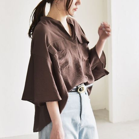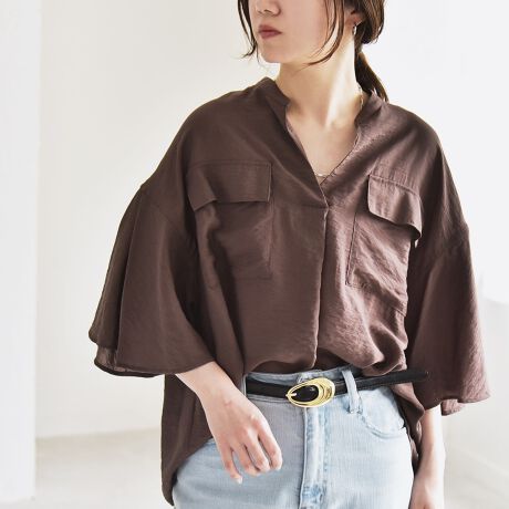 たっぷりとしたフレアスリーブがポイントのシャツブラウス。