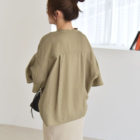 バンドカラーの首元はすっきりと見えるスキッパーデザインで、アクセサリーも映える一着。