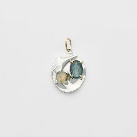 穏やかな海の揺らぐ水面からインスパイヤされたチャーム。ブルーグリーンの美しいサファイアとグレーのラブラドライトが、モダンでありながらシックな色合いも魅力の一つです。シンプルに一つだけでお使いいただくのはもちろん、他のチャームとの重ね着けもおすすめです。※天然石や天然素材を使用しているものは、サイズ・色味・風合いの違いや、若干の傷、内包物の有無などに個体差があります。予めご了承ください。※石は爪留め(のり併用)ですので水分にはご注意下さい。