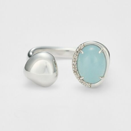 波の揺らめきを思わせる有機的なフォルムが美しいリング。艶やかなシルバーとミルキーアクアマリンの組み合わせに、波のしぶきをイメージしたダイヤモンドをあしらいアクセントをお添えます。モダンでありながら、柔らかな印象を与えるデザインです。※天然石や天然素材を使用しているものは、サイズ・色味・風合いの違いや、若干の傷、内包物の有無などに個体差があります。予めご了承ください。※サイズ直し不可。※デザインの特性上、計測サイズと、実際に着用した際のサイズ感に差があります。実際の着用感に近いサイズで表示しています。【お取扱い上のご注意】・この製品は、デザインの特性上、外部からの無理な力が加わると、変形や破損が起こりやすい作りとなっています。着用中や着脱時には下記の点に十分ご注意ください。・指がリングのサイズに合っていないまま着用すると、変形や石取れの原因となります。・電車のつり革を瞬間的に握った時や、重い荷物を持った時に、リングに負荷が掛かり変形する場合があります。・就寝時または、お子様のお世話をする際には着用しないでください。・大きく変形してしまった場合、修理でお受けできない場合もございますので、あらかじめご了承ください。