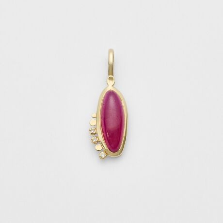 柔らかなオーバルフォルムが魅力的なルビーのチャーム。ルビーの鮮やかな色合いを存分に楽しめる大きさでありながら、すっきりとしたフォルムのため、どんなスタイルにも合わせやすいデザインです。華やかなルビーの色合いが首元をぱっと明るく彩り、地金とダイヤのコントラストがアクセントとなっています。※天然石や天然素材を使用しているものは、サイズ・色味・風合いの違いや、若干の傷、内包物の有無などに個体差があります。予めご了承ください。※ルビーは覆輪留め(のり併用)ですので水分にはご注意下さい。