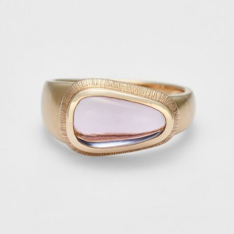 瑞々しいカットのアメジストをゴールドで贅沢に包み込んだリング。石を縁を覆うように留めるフクリン留めにより、地金と石の滑らかな一体感を実現しています。地金には異なるテクスチャーを組み合わせ、シンプルながらもアガットらしさを感じるデザインです。華美になりすぎない上品な色合いも魅力的です。※天然石や天然素材を使用しているものは、サイズ・色味・風合いの違いや、若干の傷、内包物の有無などに個体差があります。予めご了承ください。※サイズ直し不可。