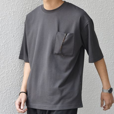 ゆったりとしたシルエットのシンプルなポケットTシャツ。