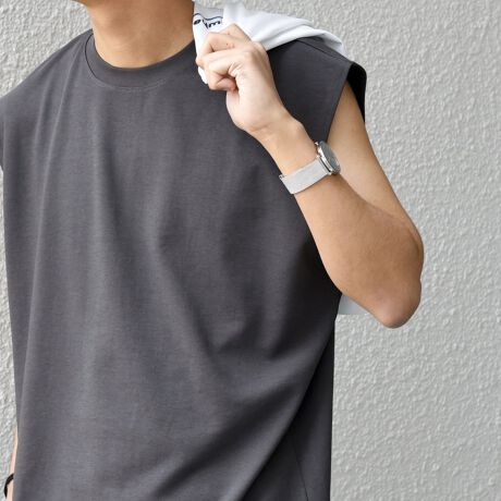 程よくゆとりを持たせたリラックスフィットのノースリーブデザイン。