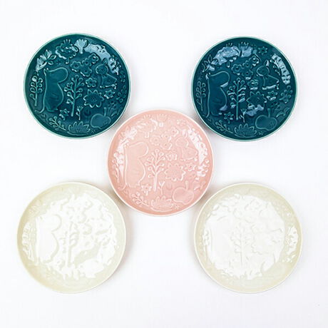 ぽこぽこしたエンボス加工を施したデザインがおしゃれなプレートです。ムーミンたちが森をお散歩しているキャベリーシリーズ。いつもより贅沢なお食事タイムを演出してくれます♪5枚セットなのでご結婚のお祝いやお誕生日などのギフトにもオススメです♪食器洗浄機、電子レンジOK。オーブンNG。